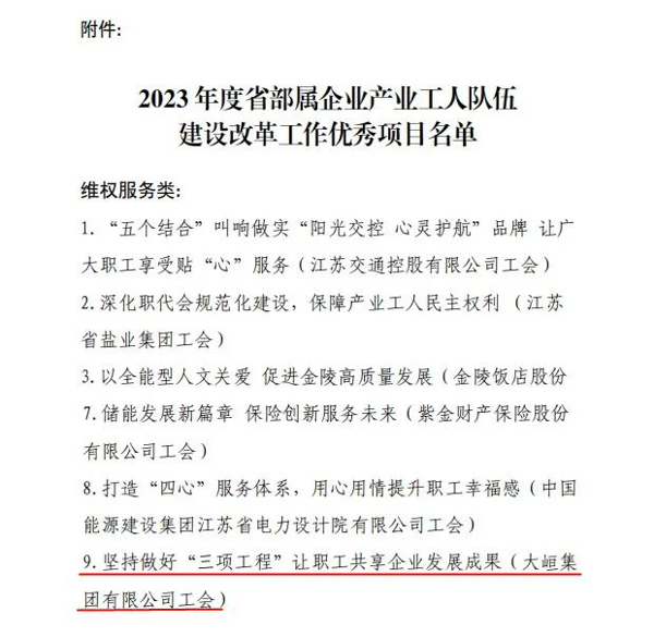 近日,江蘇省總工會發(fā)布通報,對2023年度省部屬企業(yè)產(chǎn)業(yè)工人隊伍建設(shè)改革工作優(yōu)秀項目進行表揚,大峘集團有限公司《堅持做好“三項工程” 讓職工共享企業(yè)發(fā)展成果》項目榮列其中。